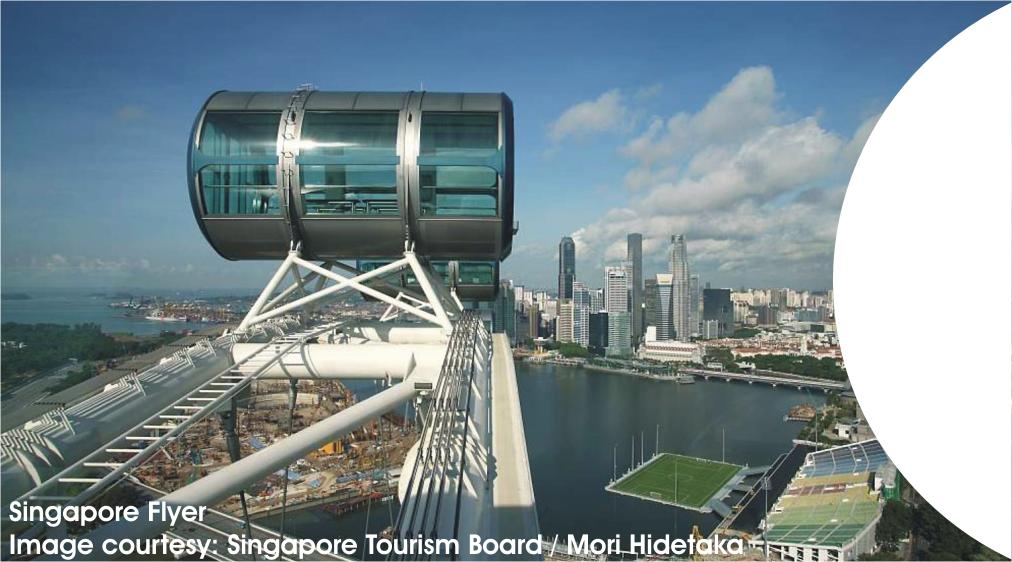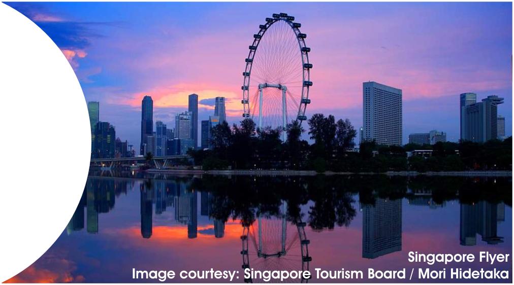 "Standing at 165m or 42 stories high, the Singapore Flyer is the tallest Observation Wheel in the World. It takes approximately 30 minutes for a complete revolution providing spectacular views of the Singapore skyline."
